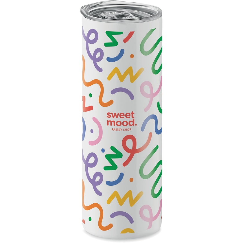 Hvitt metallkrus med mulighet for trykk over hele utsiden. High Hill, er laget av rustfritt stål. Takket være doble vegger holdes drikken både varm og kald lenger.