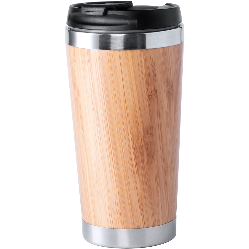 Metallkopp i rustfritt stål med utside av ekte bambus. Koppen rommer 45 cl og leveres i en gaveeske. Merking skjer med lasergravering.