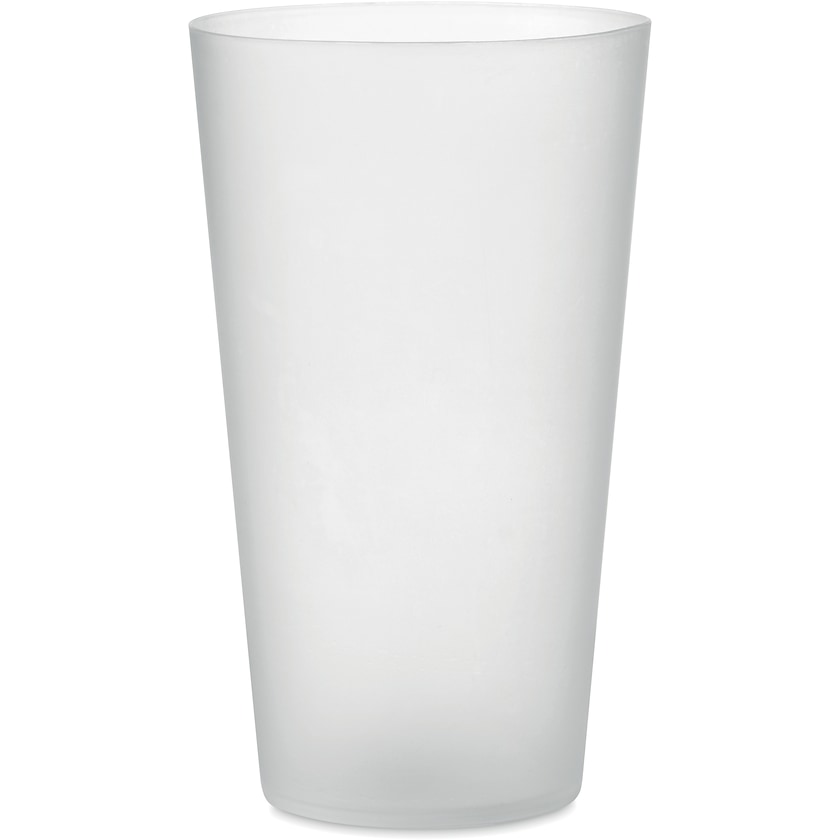 Frostet plastkrus med trykk. Koppen rommer 55 cl og er et utmerket alternativ til engangskopper.