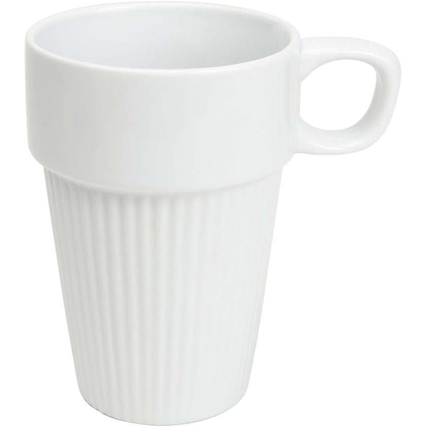 Porselenskopp som kan stables med en lite håndtak. Koppen er laget av slitesterk feltpatsporselen og tåler bruk i både ovn og microbølgeovn.