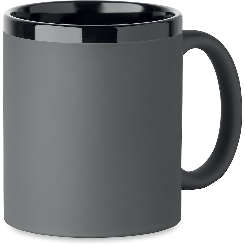 Krus med soft-touch-ytterside og svart innside og kant. Merking gjøres med lasergravering som fremstår i svart. Leveres enkeltpakket i hvite kartonger.