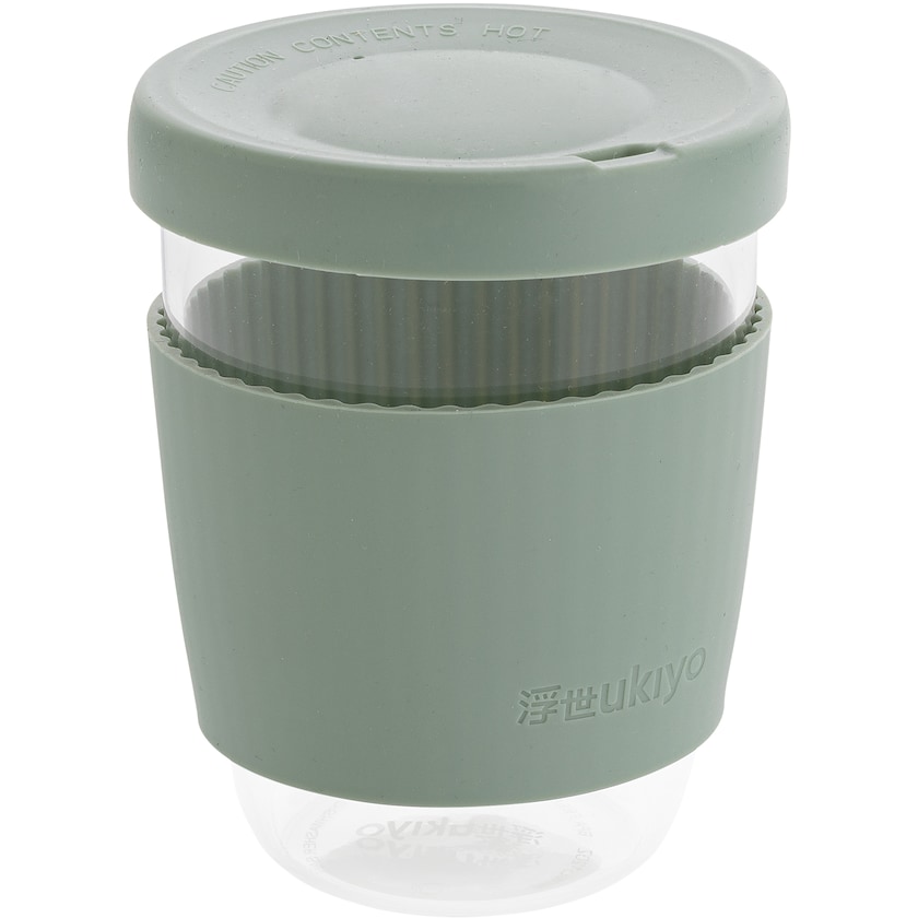 Takeaway-krus av glass fra Ukiyo. Grepet og lokket er laget av silikon. Lokket har en liten åpning slik at damp kommer ut. Glasset er av typen borosilikat, som betyr at det er ildfast og veldig slitesterkt.