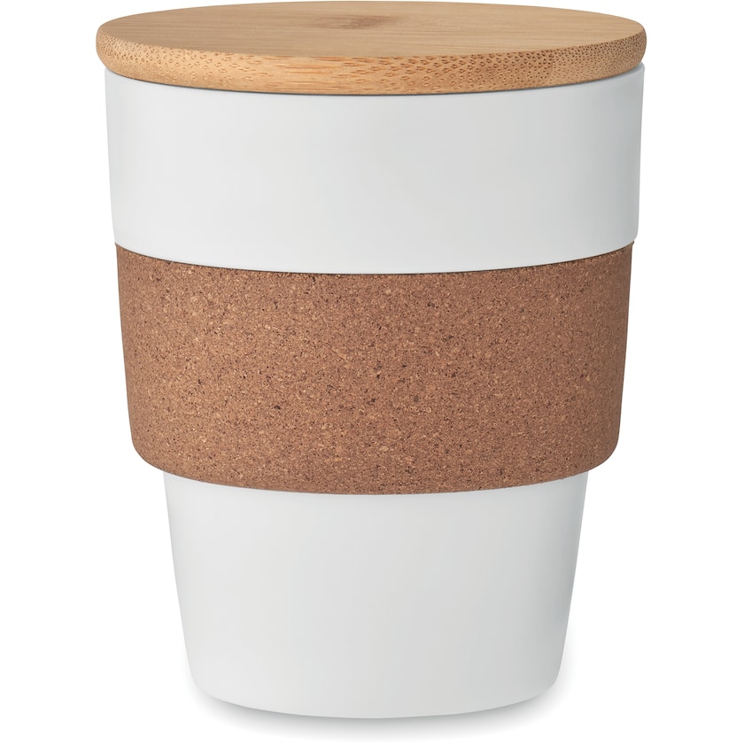 Takeaway-krus er resirkulert polypropen, kork og bambus. Kruset har en enkel vegg, noe som gjør at det kan forekomme varmeoverføring.