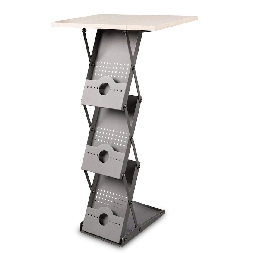 Brosjyrestativ som også fungerer som messebord. Duo er laget av robust metall og har en bordplate i lett treverk. Brosjyrestativet har tre hyller til A4-brosjyrer. Du trenger ikke verktøy eller montering for å sette opp stativet. Oppslått er brosjyrestativet 101 cm høyt. Når brosjyrestativet ikke er i bruk, oppbevares det i den inkluderte aluminiumskofferten. 1 års garanti.