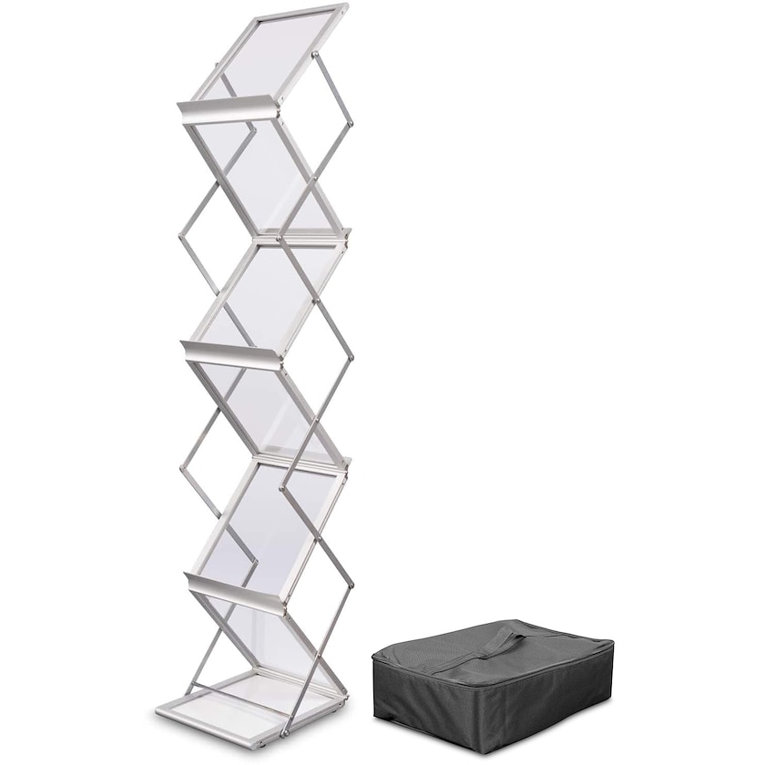 Stilig brosjyrestativ av aluminium. Flex Standard har 6 hyller til brosjyrer. Hvert hylle er 30,5 x 22 cm. Oppslått er brosjyrestativet 146 cm høyt. Sammenfoldet er det 11 x 25,6 x 40 cm. Monteringen er rask og du trenger ikke verktøy. Leveres med en praktisk oppbevaringsveske. 1 års garanti.