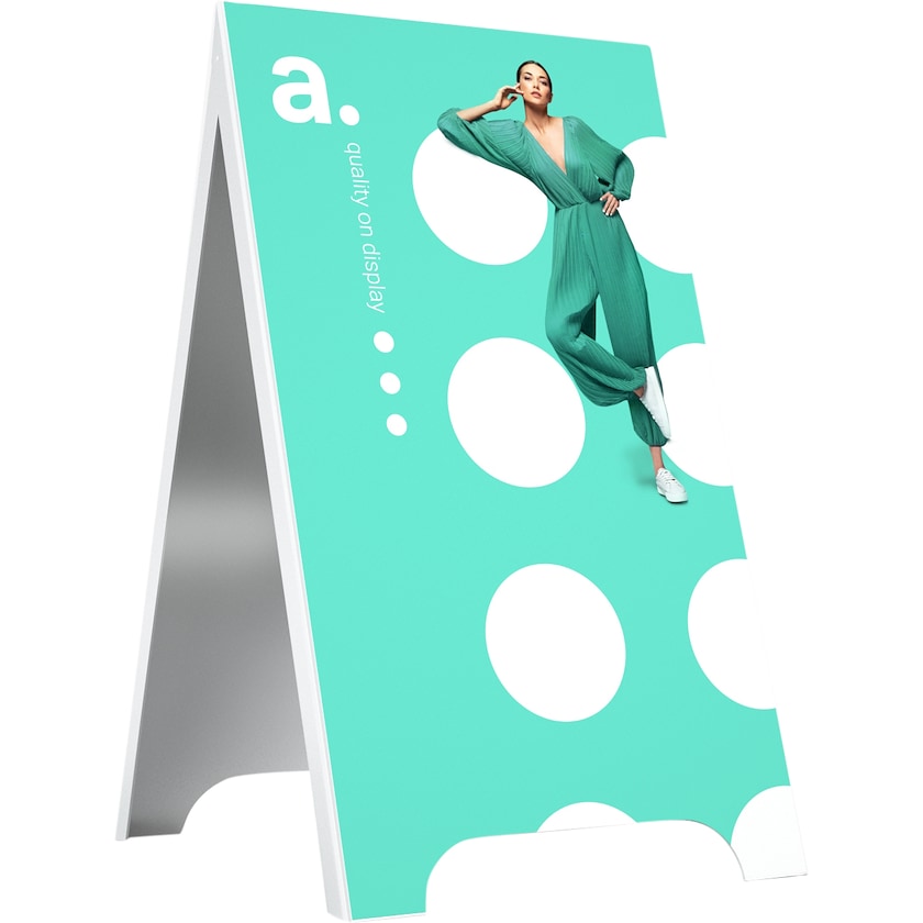 Gatebukk med stilig design av solid polystyren. Både selve gatebukken og trykket tåler bruk i flere år. Bruk utendørs er helt problemfritt. Trykket, som beskyttes av laminering, gjøres på begge siden av gatebukken.