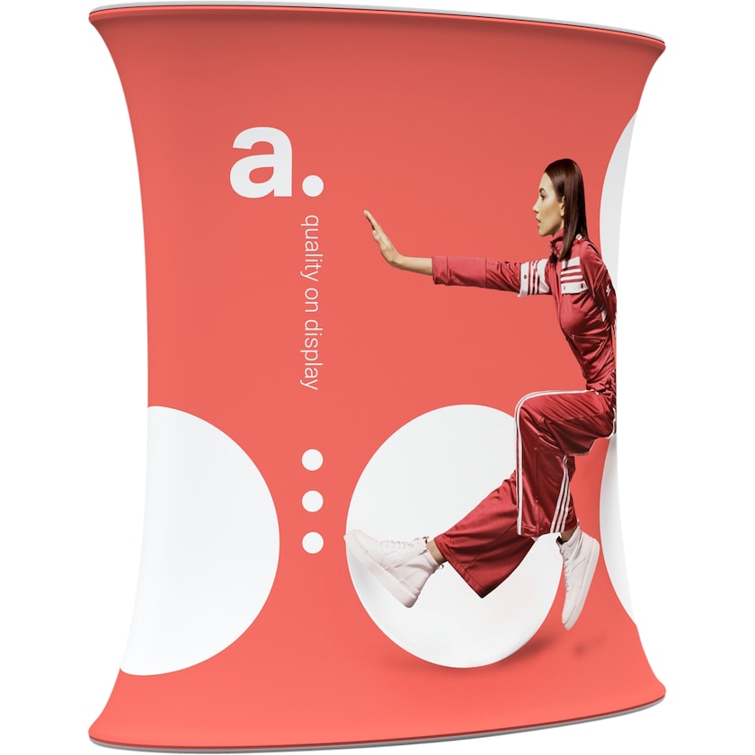 Stabilt og veldig smidig messebord med eget trykk. Arc Oval, har en robust konstruksjon av aluminiumsrør dekket med polyesterstoff. Toppen er laget av MDF. Utstillingsbordet monteres enkelt ved at stoffets silikonkant festes til systemet, noe som gir en sømløs konstruksjon. Ved behov kan stoffet bestilles separat slik at motivet på messebordet kan fornyes. Leveres i en smart oppbevaringspose.