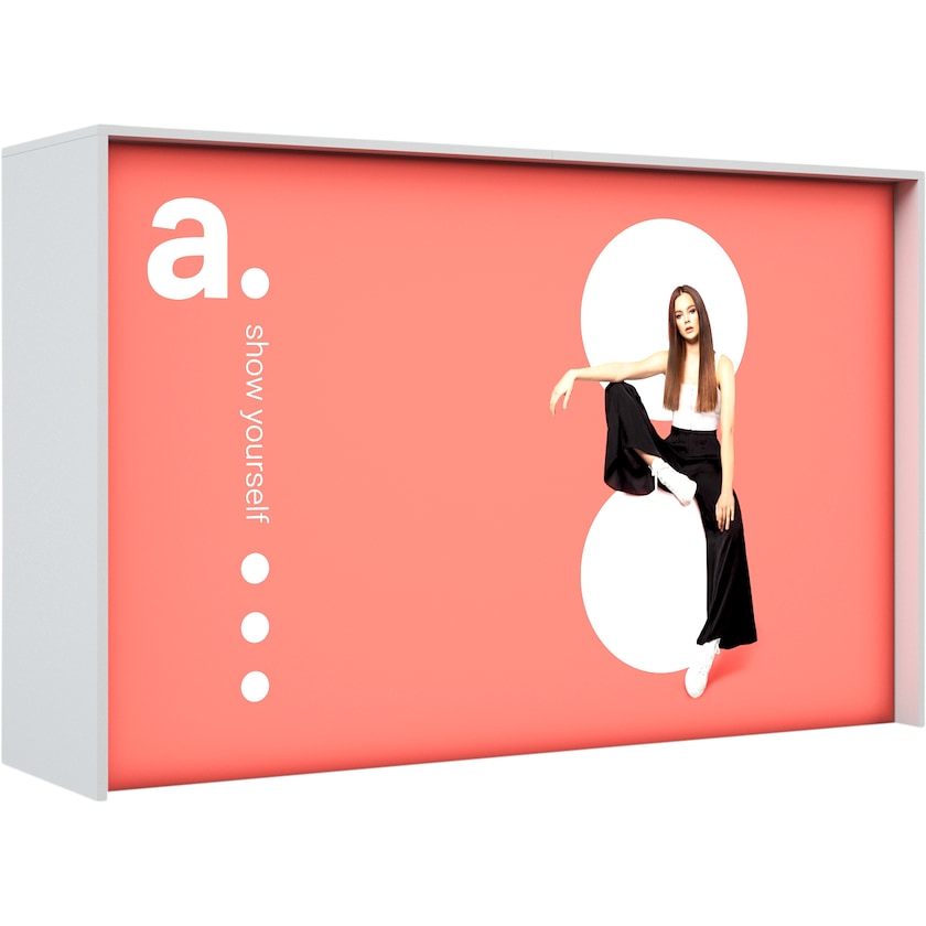 LED-opplyst messebord som er hele 150 cm bredt. Messebordet har en smart konstruksjon med en tekstilgardin med LED-lys, som lyser opp motivet. Monteringen er veldig enkel og du trenger ikke verktøy. Delene klikkes ganske enkelt sammen. Ønsker du å endre motivet i fremtiden, er det bare å bestille nytt trekk hos oss. En oppbevaringspose med hjul er inkludert.