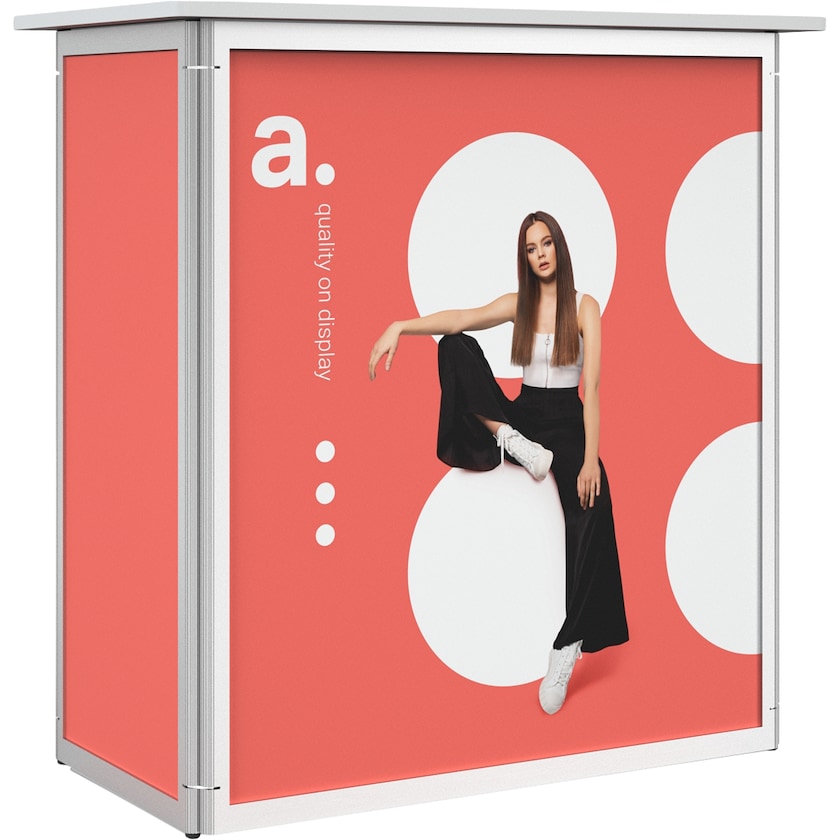 Lettmontert messebord av høy kvalitet Trykket gjøres på laminerte PVC-plater som settes inn i aluminiumskonstruksjonen. Alt du må gjøre er å løfte ut messebordet av vesken, folde ut sidene og låse konstruksjonen ved hjelp av bordplaten og hyllen.