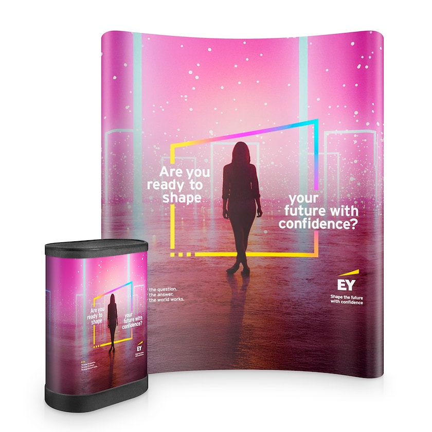 Sett med messevegg Pop Up Small, messebord og belysning. Et sett som passer de fleste utstillingsmiljøer og behov. Messevegen er 200 cm bred og har en pen, buet form. Monteringen kan gjøres av bare én person og krever ingen verktøy. Stoffet festes ved hjelp av et magnetbånd. Prisen inkluderer trykk på både messeveggen og messebordet. Trykket på messeveggen plasseres på fronten og begge kortsidene. Messebordet er utstyrt med hjul og fungerer også som oppbevaring.