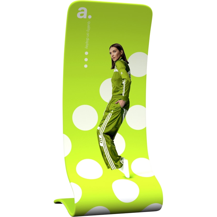Messevegg med spennende S-form. Messeveggen har en smart konstruksjon av aluminiumsrør som monteres sammen til en bue. Monteringen gjøres helt uten verktøy. Etter at buen er montert, så trekker du bare duken over rammen og lukker med en glidelås. Duken trykkes med miljøvennlig, vannbasert farge på både for- og baksiden. Ved behov kan duken vaskes på 30 grader i vaskemaskin. Om du i fremtiden bytter motiv, bestiller du bare en ny duk.
