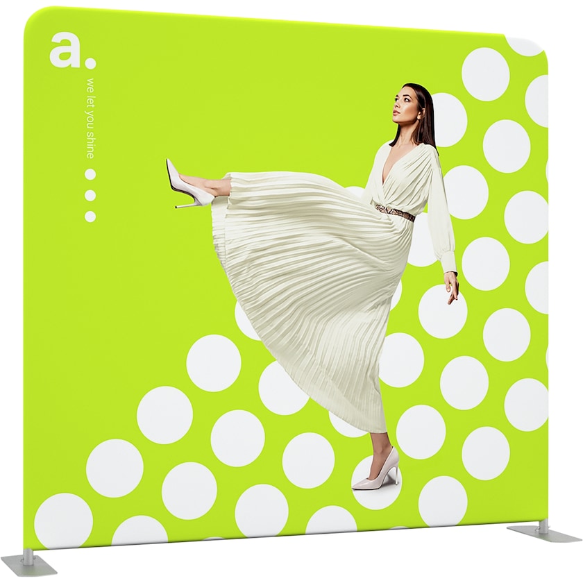 240 cm bred messevegg som er veldig lett å montere. Messeveggen er laget av aluminiumsrør som du kan montere uten verktøy til en bue. Duk med trykk trekkes deretter over buen og lukkes med en glidelås. Resultatet blir en messevegg uten folder og rynker. Trykket gjøres med miljøvennlig, vannbasert farge på begge sidene. Siden messeveggen både er lett og montere og veier lite, er den perfekt til spontane arrangementer og kampanjer. Stoffet tåler maskinvask i 30 grader. Du kan kjøpe flere duker så motivet kan byttes ut.
