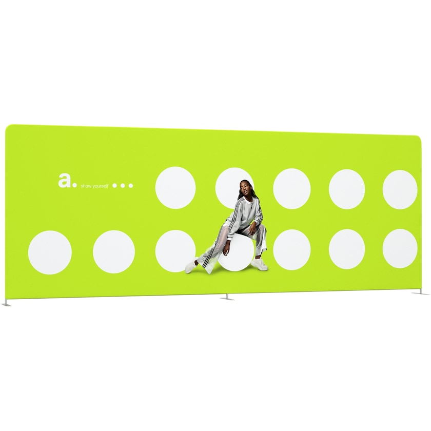 Enorm messevegg med en bredde på hele 600 cm. Messeveggen har en smart konstruksjon av aluminiumsrør som monteres sammen til en bue. Monteringen er veldig enkel og du trenger ikke verktøy. Duken som trykkes helt etter dine instruksjoner, trekkes deretter over buen og lukkes med en glidelås. Resultatet blir en rynkefri messevegg uten folder. Duken trykkes med en miljøvennlig, vannbasert farge på både for- og baksiden. Stoffet kan vaskes vaskemaskin på 30 grader. Hvis du på et senere tidspunkt ønsker å bytte ut motivet på messeveggen, bestiller du bare en ny duk med trykk fra oss.