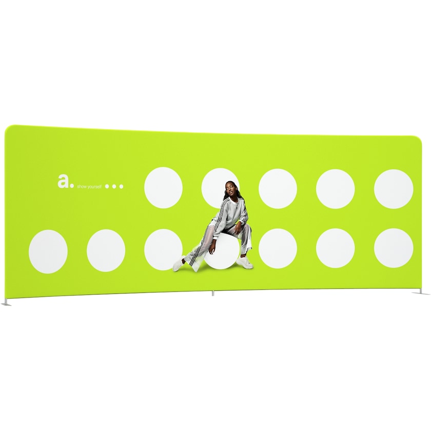 Lettere buet messevegg med bredde på hele 600 cm. Den buede formen gir messeveggen en interessant 3D-effekt. Konstruksjonen består av aluminiumsrør som settes sammen til en bue. Du trenger ikke verktøy til monteringen. Duken, som påføres ditt eget trykk, trekkes deretter over buen og lukkes med en glidelås. Duken trykkes med vannbasert, miljøvennlig farge på begge sidene. Er du uheldig og noen tilfeldigvis skulle lage flekker på duken, kan den vaskes i vaskemaskin på 30 grader. Om du i fremtiden ønsker å fornye motivet på messeveggen, så bestiller du bare en ny duk med trykk fra oss.