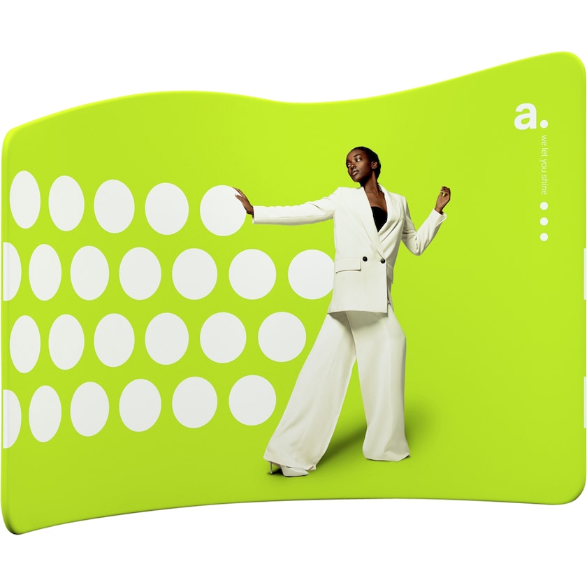 Mykt, bølgeformet montervegg som er 300 cm bred. Den myke formen blir til en vakker messevegg til arrangementet. Messeveggen er laget av aluminiumsrør som settes sammen til en bue. Delene settes sammen helt uten verktøy. Duken med ditt eget trykk, trekkes over buen og lukkes med en glidelås. Trykket gjøres helt miljøvennlig med vannbasert farge på for- og baksiden. Trenger du noen gang å vaske duken, så kan du kjøre den i vaskemaskin på 30 grader. Ønsker du flere motiv? Da bestiller du bare enda en duk hos oss. En praktisk oppbevaringsveske er inkludert.