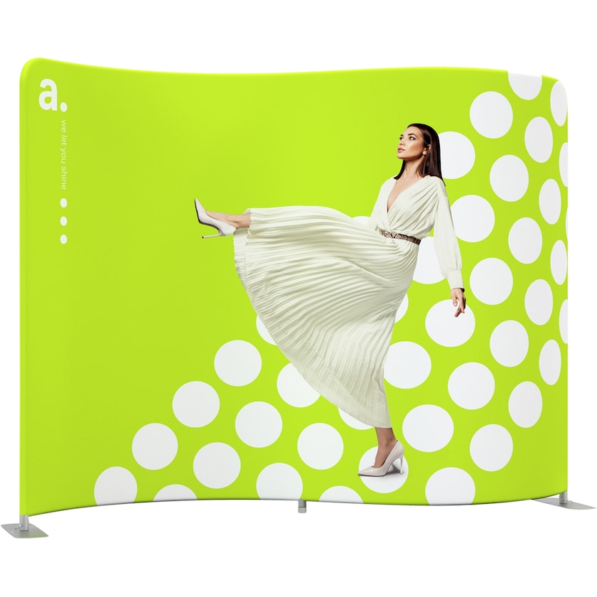 300 cm bred messevegg med en spennende serpentinform. En messevegg som skaper oppmerksomhet bare gjennom formen! Messeveggen har en myk, bølgende form med en konstruksjon av aluminiumsrør som settes sammen til en bue. Monteringen av buen krever ikke verktøy. Duken, som vi trykker helt etter dine instruksjoner, trekkes over buen og lukke med en glidelås. Vanskeligere enn det er det ikke! Duken trykkes med vannbasert farge på begge sidene. Ved behov kan duken vaskes i vaskemaskin i 30 grader. Om du i fremtiden ønsker å fornye motivet, så bestiller du helt enkelt bare en ny duk med trykk hos oss.