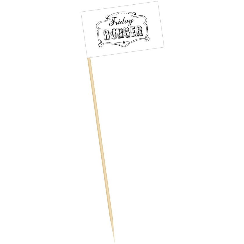 150 mm papirflagg med eget trykk til hamburgere. Flaggene er laget av matt papir og pinnen er laget av tre. Selve flagget har målene 30 x 50 mm. Trykket skjer på begge sider av flagget. Profiler din hamburger på en kul måte!