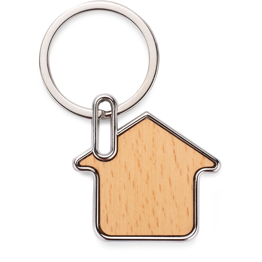 Nøkkelring med trykk formet som et hus. Nøkkelringen er laget av tre og metall. Leveres i et brunt etui. Merking gjøres enten på konvolutten eller lasergravering på nøkkelringen.