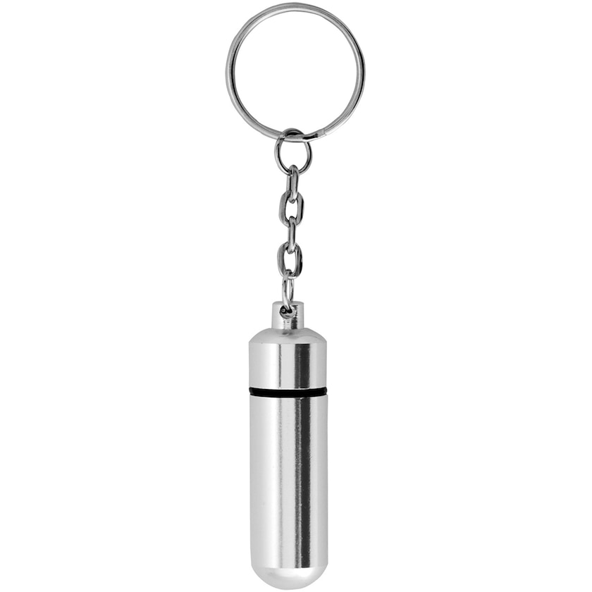 Nøkkelring med liten pilleboks av aluminium. Smart pilleboks som du kan ha på nøkkelknippet. Merking skjer med lasergravering.