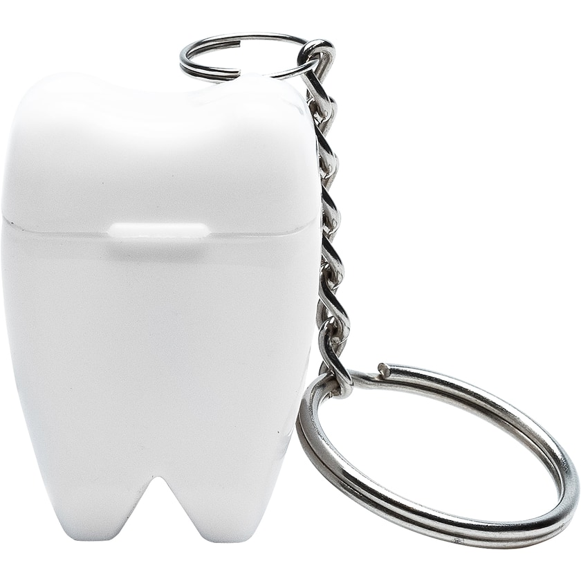Nøkkelring formet som en tann, som inneholder 5 meter tanntråd. Passer på at tennene holdes frisk uansett hvor du befinner deg. En utmerket profileringsartikkel for tannleger.
