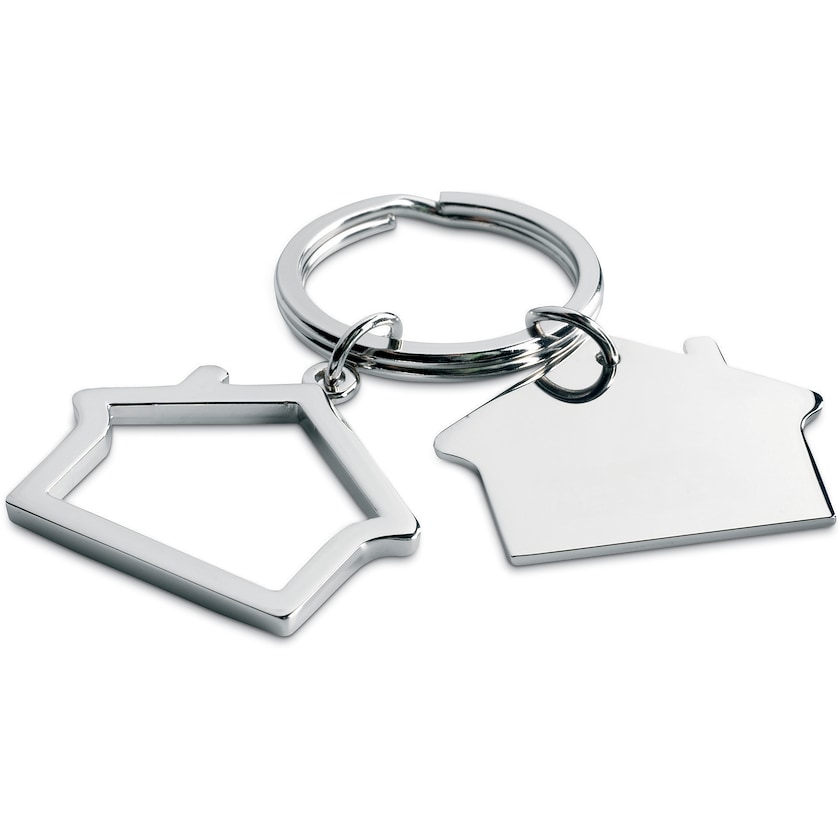 Husformet nøkkelring av metall. Nøkkelringen leveres i en sort gaveeske.
