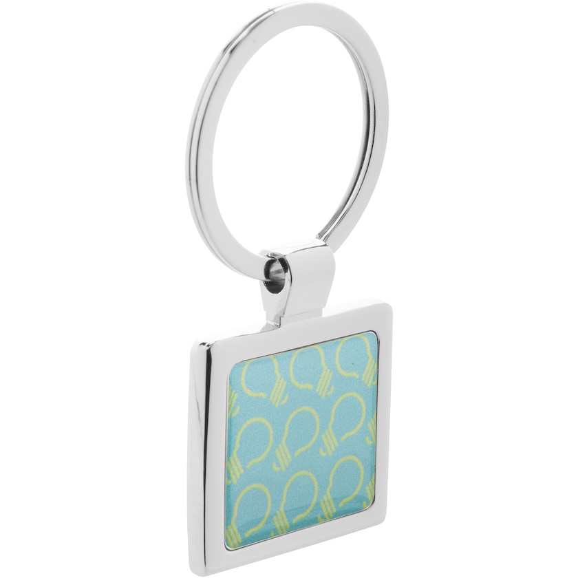 Kvadratisk metallnøkkelring med digitaltrykk. En pen, nøkkelring i krom med stor trykkoverflate. Leveres i pen gaveeske.
