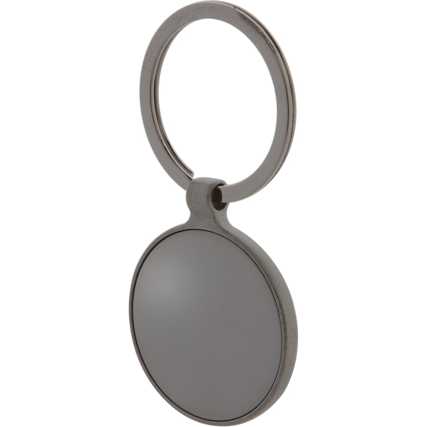 Rund metallnøkkelring med våpenstål finish. Begge platene er blanke og resten av nøkkelringen er matt. Merking gjøres med lasergravering. Nøkkelringen leveres i en svart gaveeske.