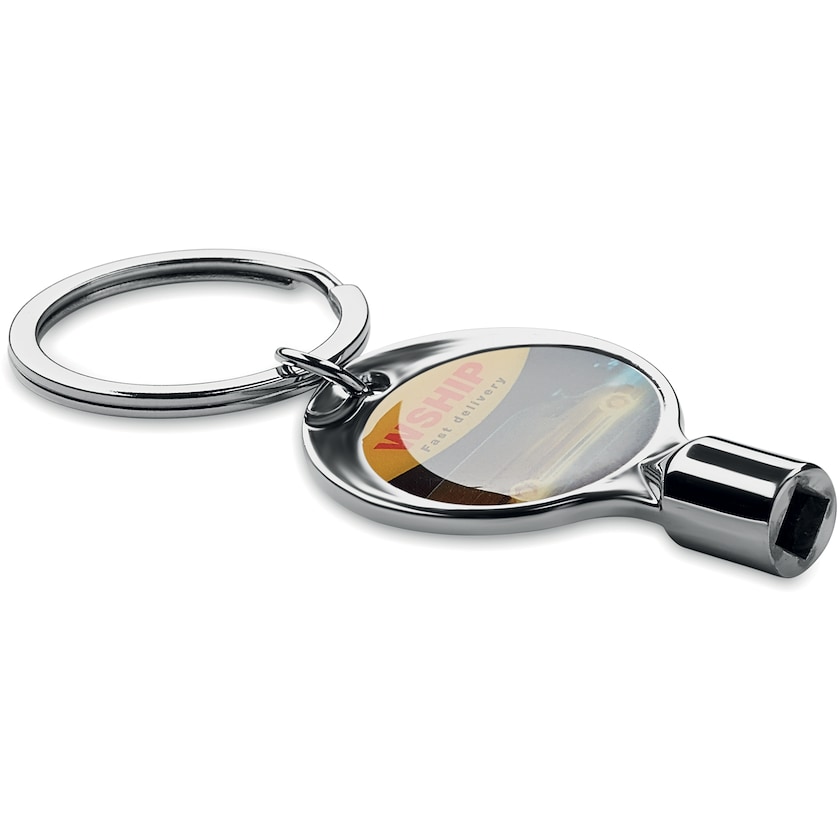 Universalnøkkel med nøkkelring. Logoen digitaltrykkes på den ene siden og påføres et beskyttende epoksylag. Levers enkeltpakket i silkepapir. En perfekt profileringsartikkel til f.eks. VVS-bedrifter og eiendomsselskap.