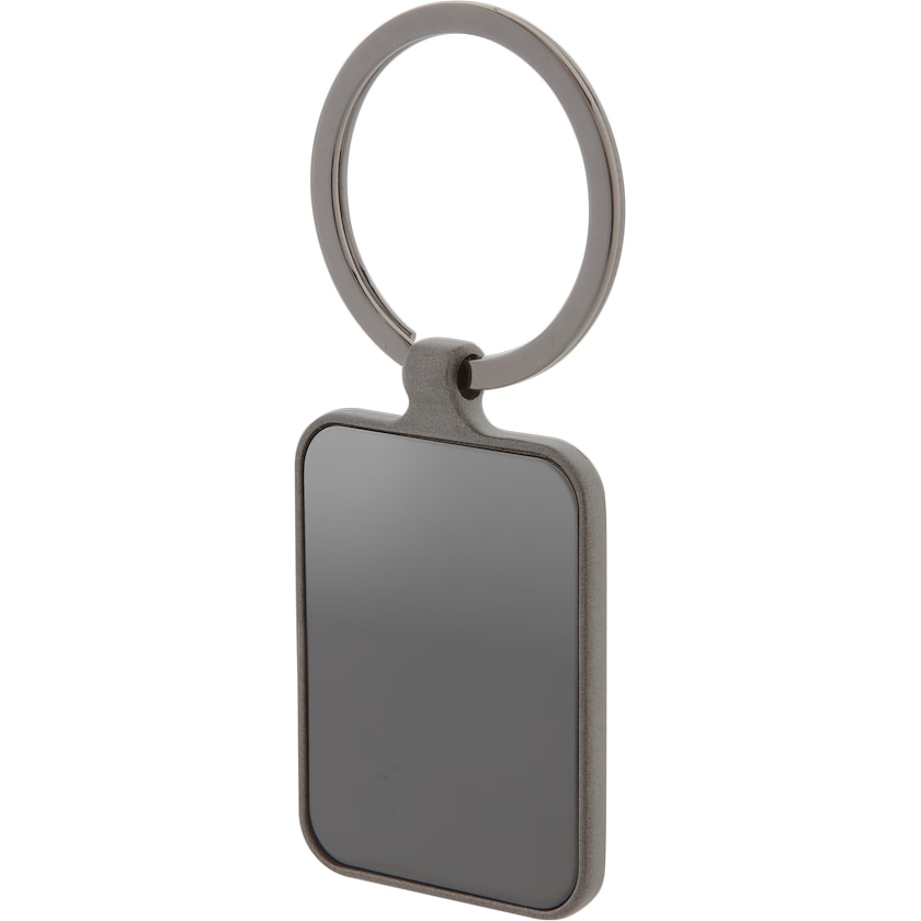 Rektangulær metallnøkkelring med finish som våpenmetall. Begge platene er blanke og resten av nøkkelringen er matt. Leveres i en svart gaveeske.