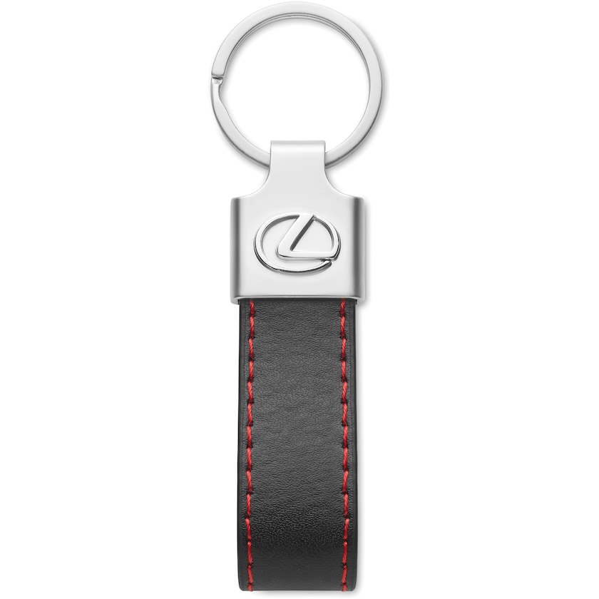 Nøkkelring av metall og kunstskinn. Kunstskinnet kan leveres i et stort antall ulike standardfarger (se trykkmal). Sømmene kan leveres i valgfri farge. Bedriftens logo preges inn i metallet.