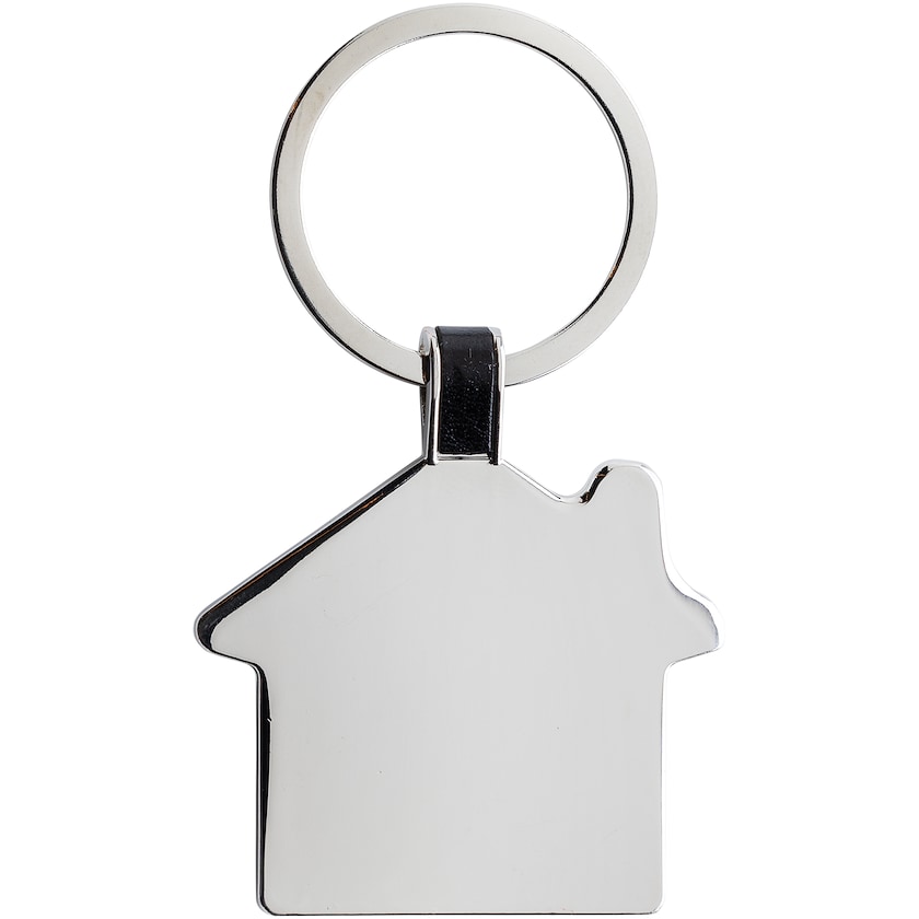 Husformet nøkkelring av resirkulert metall. Merking gjøres med lasergravering.