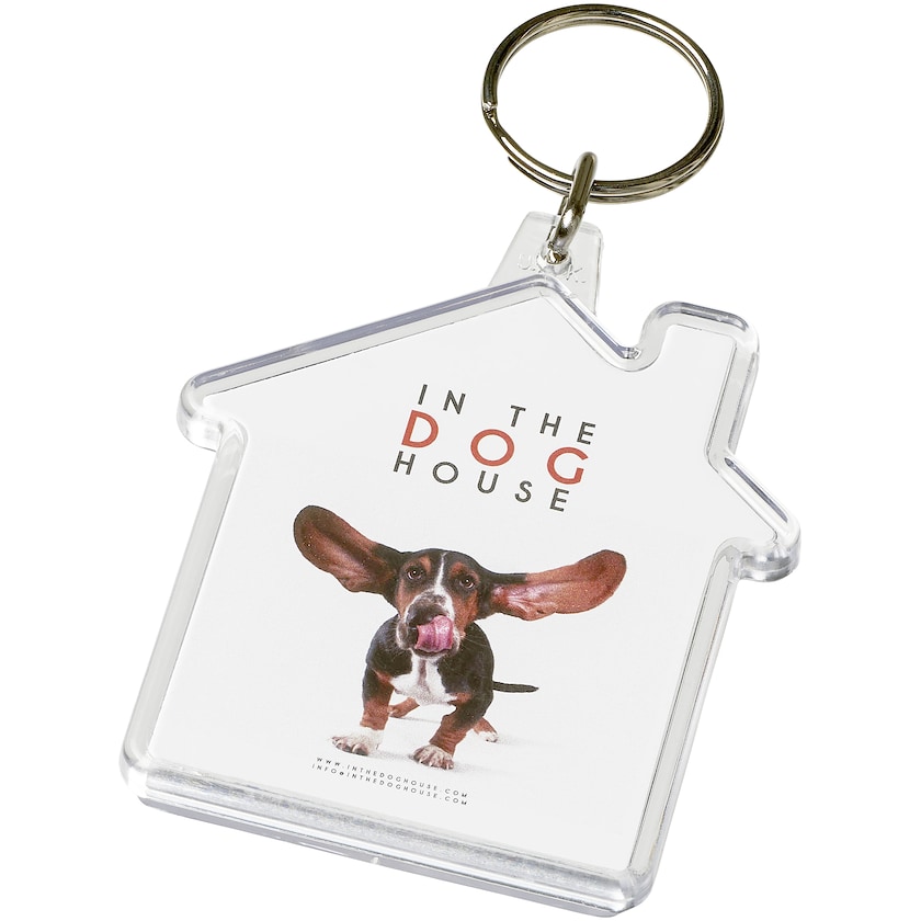 Miljøvennlig husformet nøkkelring med eget trykk. Merket er produsert av det miljøvennlige materialet GPPS. Trykket gjøres på begge sidene av papiret som plasseres inne i GPPS-plasten på nøkkelringen. De to sidene kan ha forskjellig trykk. Nøkkelringen er produsert i Europa.