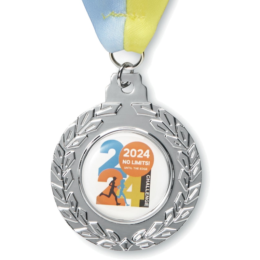 Medalje i standardform med senter med eget trykk. Trykket gjøres med digitaltrykk og beskyttes av et epoksybelegg. Metallet kan være i gull-, sølv- eller bronsefarge. Båndet er 80 cm langt og begge sider påføres ditt eget trykk.