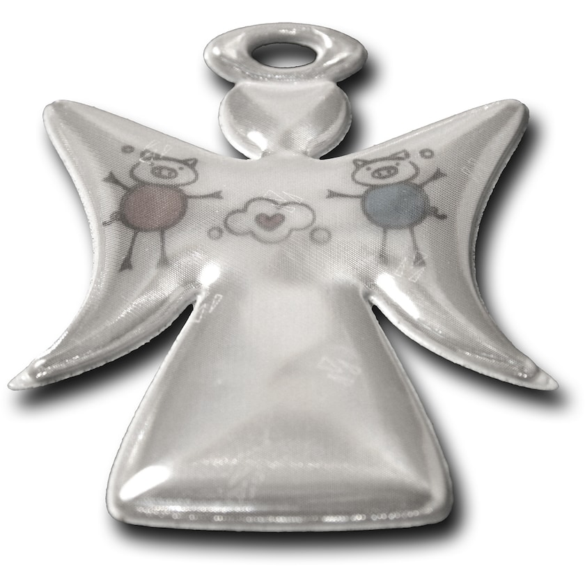 Vakker mykrefleks i form av en engel. Refleksen leveres enten med snøre og sikkerhetsnål eller kulelenke. Refleksmaterialet oppfyller EN13356:2001. For at refleksen ikke skal miste kraften skjer trykket under refleksoverflaten.