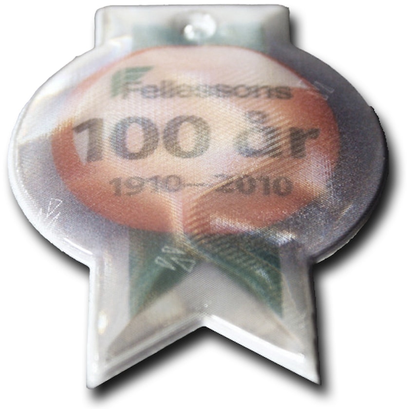Refleks i høyklassifisert, mykt refleksmateriale. Refleksen leveres enten med lenke i metall eller snøre og sikkerhetsnål. Refleksmaterialet kommer fra 3M Scotchlite og oppfyller kravene til EN13356:2001. For at refleksen ikke skal miste kraften skjer trykket under refleksoverflaten.