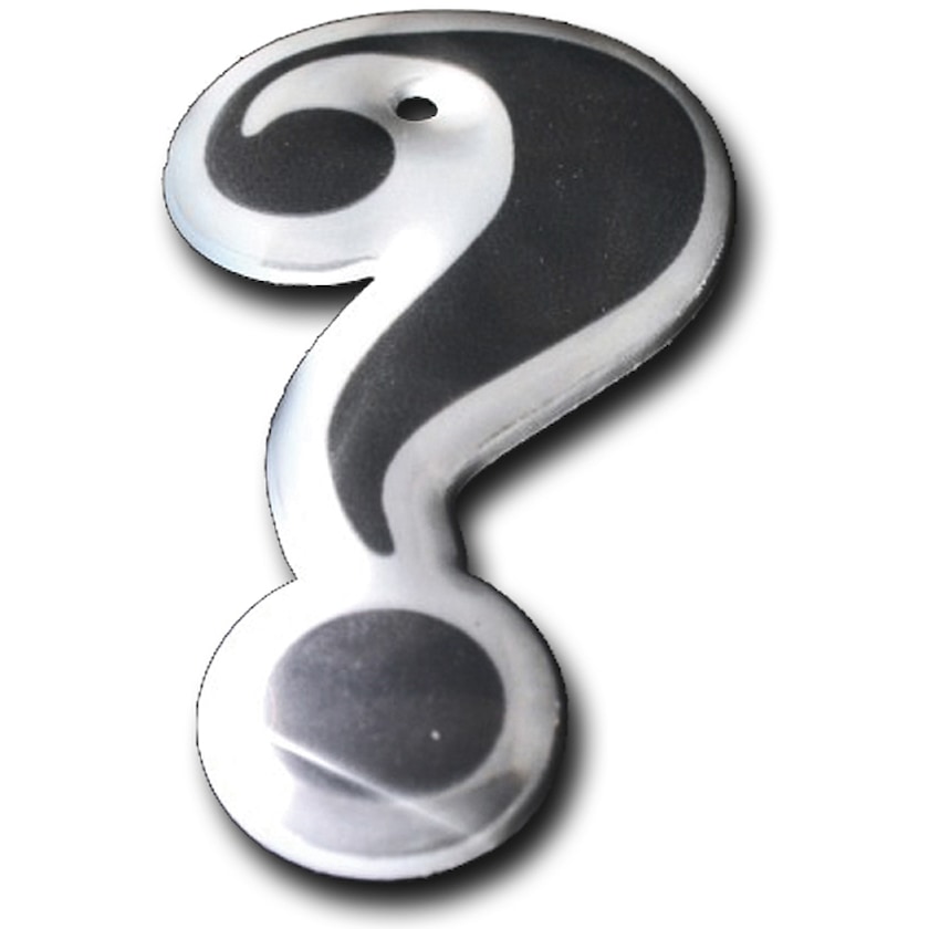 Mykrefleks i form av et spørsmålstegn. Refleksen leveres enten med snøre og sikkerhetsnål eller kulelenke. Refleksmaterialet oppfyller EN13356:2001. For at refleksen ikke skal miste kraften skjer trykket under refleksoverflaten.