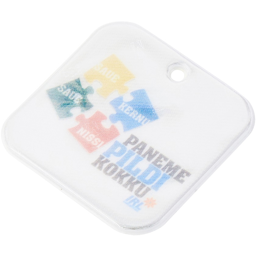 Firkantet mykrefleks av høyeste kvalitet. Refleksen leveres enten med lenke i metall eller snøre og sikkerhetsnål. Refleksmaterialet kommer fra 3M Scotchlite og oppfyller kravene til EN13356:2001. For at refleksen ikke skal miste kraften skjer trykket under refleksoverflaten.