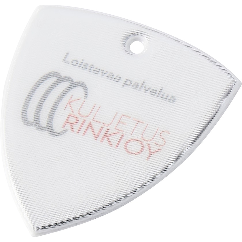 Mykrefleks formet som et våpenskjold Refleksen leveres enten med lenke i metall eller snøre og sikkerhetsnål. Refleksmaterialet kommer fra 3M Scotchlite og oppfyller kravene til EN13356:2001. For at refleksen ikke skal miste kraften skjer trykket under refleksoverflaten.