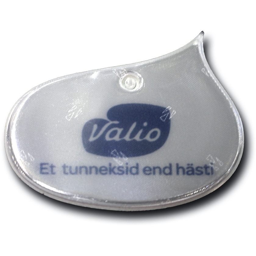Kul mykrefleks formet som en prateboble. Refleksen leveres enten med snøre og sikkerhetsnål eller kulelenke. Refleksmaterialet oppfyller EN13356:2001. For at refleksen ikke skal miste kraften skjer trykket under refleksoverflaten.