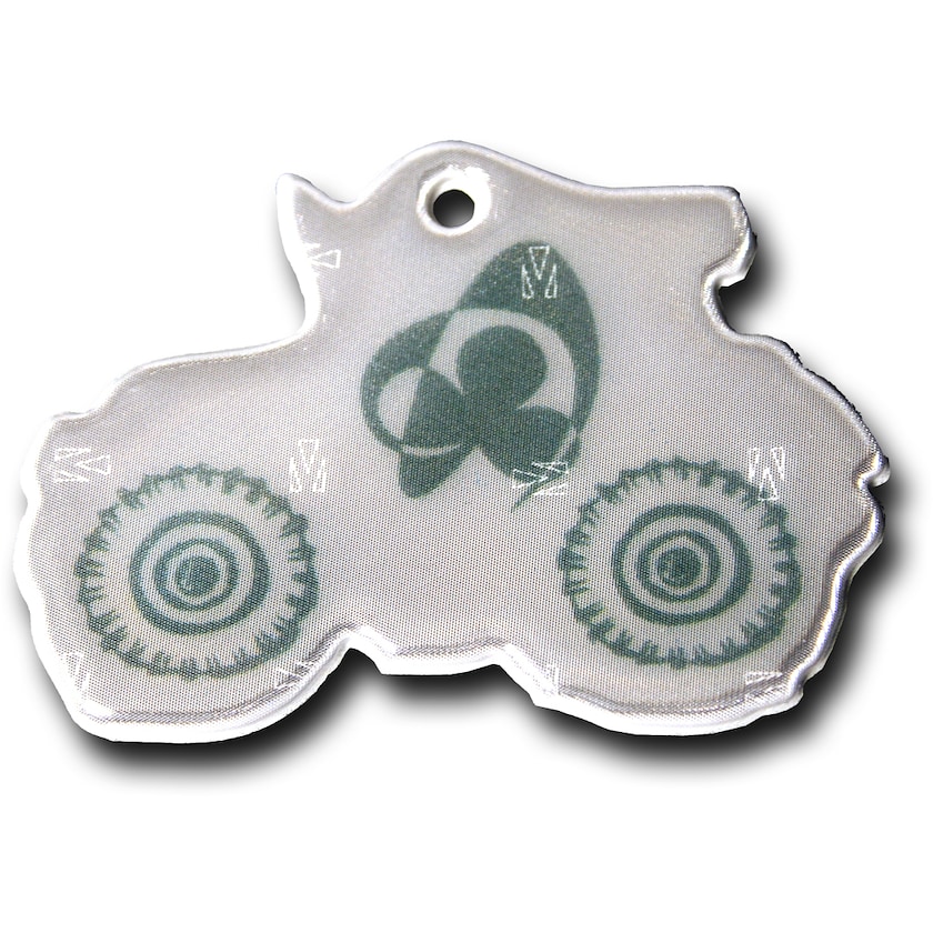 Mykrefleks i form av en traktor. Favoritten blant alle jordbrukere. Refleksen leveres enten med kulelenke eller snor og sikkerhetsnål. Refleksmaterialet, som enten kan kjøpes i hvit eller gul farge, kommer fra 3M Scotchlite og oppfyller kravene til EN13356:2001. For at refleksfunksjonen ikke skal skades, gjøres trykket under refleksoverflaten.