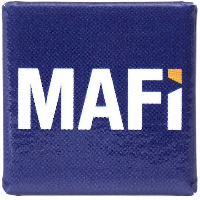 Liten, kvadratisk button. På baksiden finnes en sikkerhetsnål.