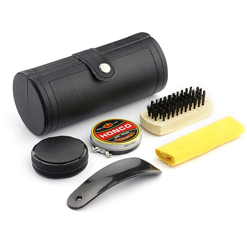 Skopussesett bestående av skokrem, skohorn, skobørste og pusseklut. Merking gjøres ved gravering på esken.