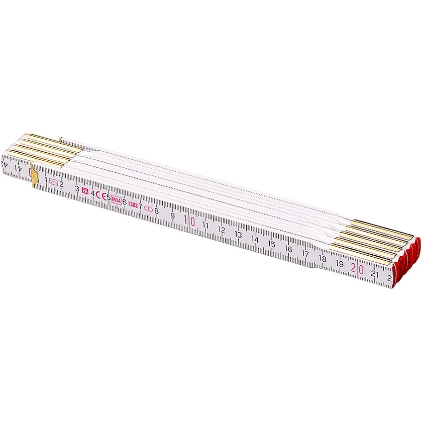 2-meters tretommestokk for professionellt bruk. Tommestokken er laget av bøk i høy kvalitet og har messingsoverdratte og ekstra forsterkede stålledere. Lederene er usynlige fra utsiden. Treet er malt og med to lag farge og dessuten utstyrt med en beskyttende overflate. Tommestokken er laget i EU og oppfyller EC type-examination certificate, EC-accuracy class III och EC conform.