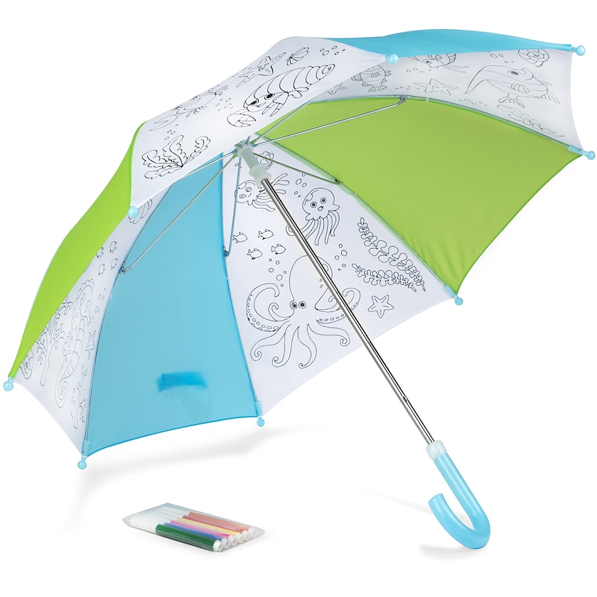 Barneparaply som du kan tegne på. 6 stk fargepenner inkludert. Paraplyen er manuell. En profileringsartikkel som både er praktisk og stilig for barna!