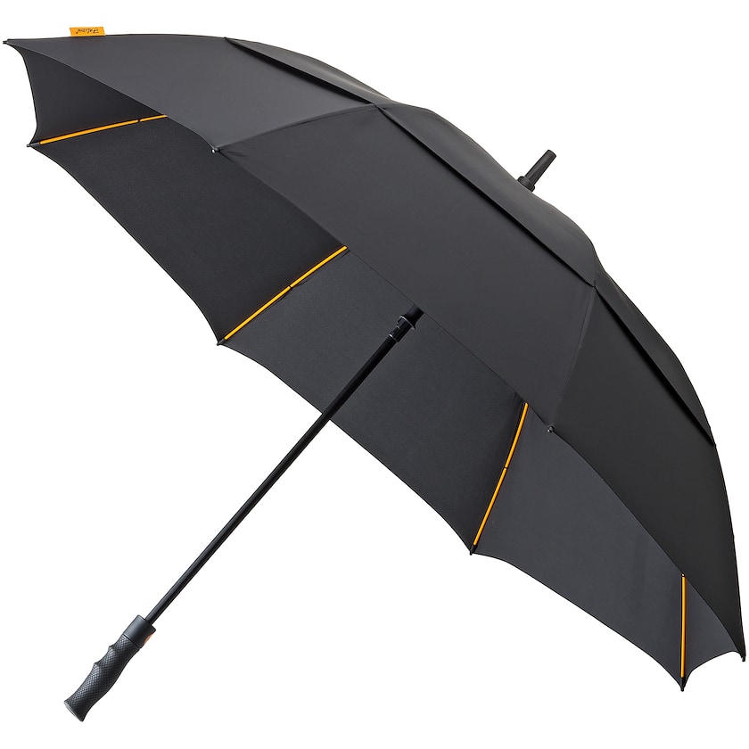 Golfparaply i høy kvalitet med konstruksjon og paraplystang av fiberglass. Paraplyen har et ventilasjonssystem og et behagelig gummiert håndtak. Leveres i et oppbevaringsfuttteral.