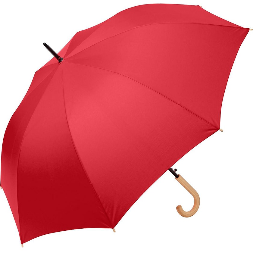 Miljøvennlig golfparaply med stoff av resirkulert polyester. Paraplyen har detaljer av ekte tre og resirkulert plast. Håndtaket er av tre. Stoffet er farget med en miljøvennlig metode som ikke krever like mye vann som vanlig.