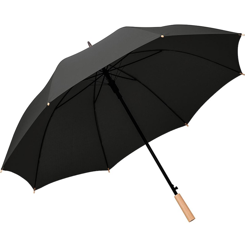Miljøvennlig golfparaply av høy kvalitet. Paraplyen har en forsterket konstruksjon som tåler kraftige regnbyger. Stoffet er laget av polyester og håndtaket av tre. Spilene er laget av glassfiber og stangen av galvanisert stål.