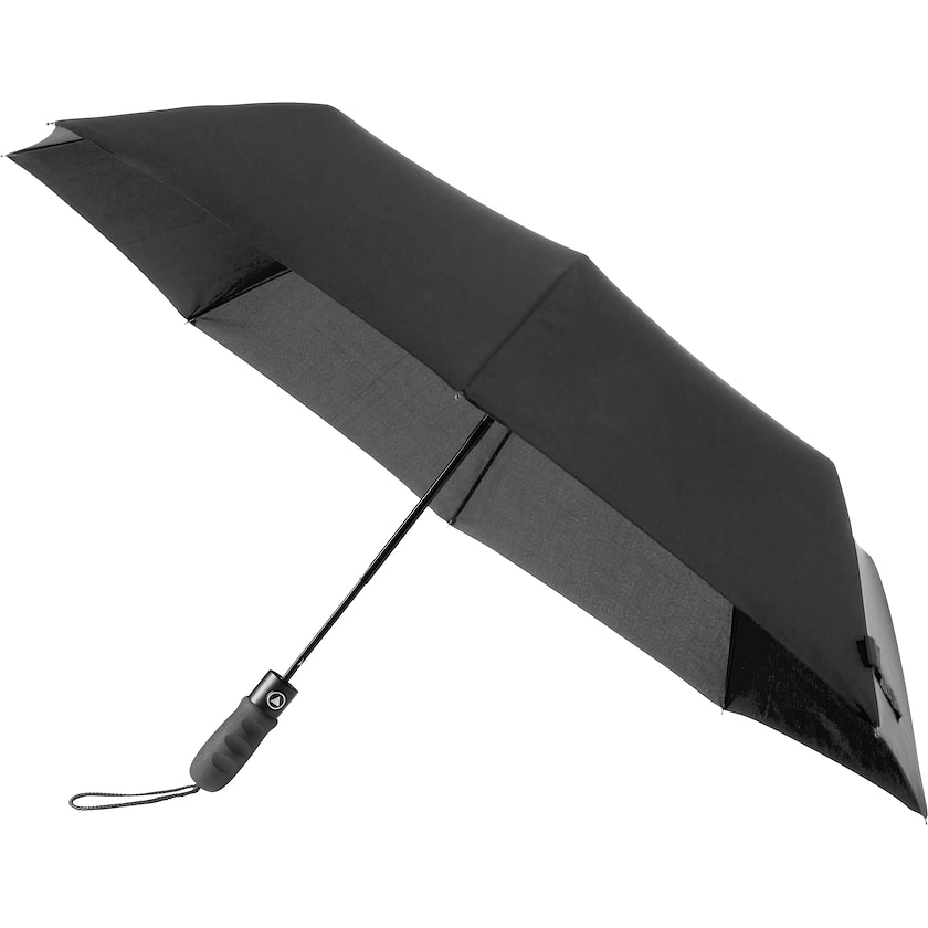 Påkostet sammenleggbar paraply med trykk. Paraplyen har paraplystang og spiler av metall. Håndtaket er veldig behagelig å holde i. Automatisk åpning.