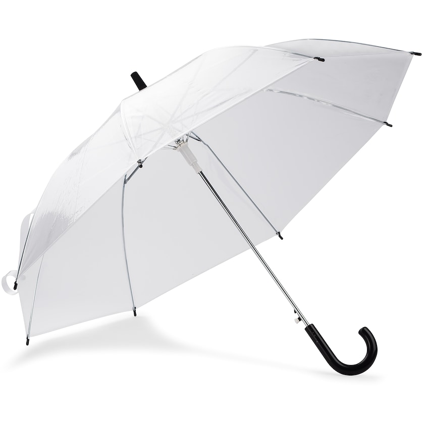 Transparent paraply med bøyd håndtak. Åpnes automatisk. Trykket kan gjøres i maksimalt tre farger.