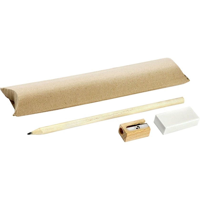Det lille settet inneholder blyanter, viskelær og blyantspissere. Settet kommer i et naturfarget pappomslag.